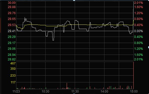 2011年11月23日臨近收盤期間(14:56:24至14:59:28),任某某為了在短期內(nèi)拉升股價,大量申報買入“X”4筆共計63,000股,占尾市階段市場申買量的比例高達75.54%;委托價格由29.60元升至32.00元,每筆均高于當(dāng)時市場上的買1檔價格,三分鐘內(nèi)將股價由29.35元拉升至30元收盤,拉升幅度達2.21%。(見下圖)